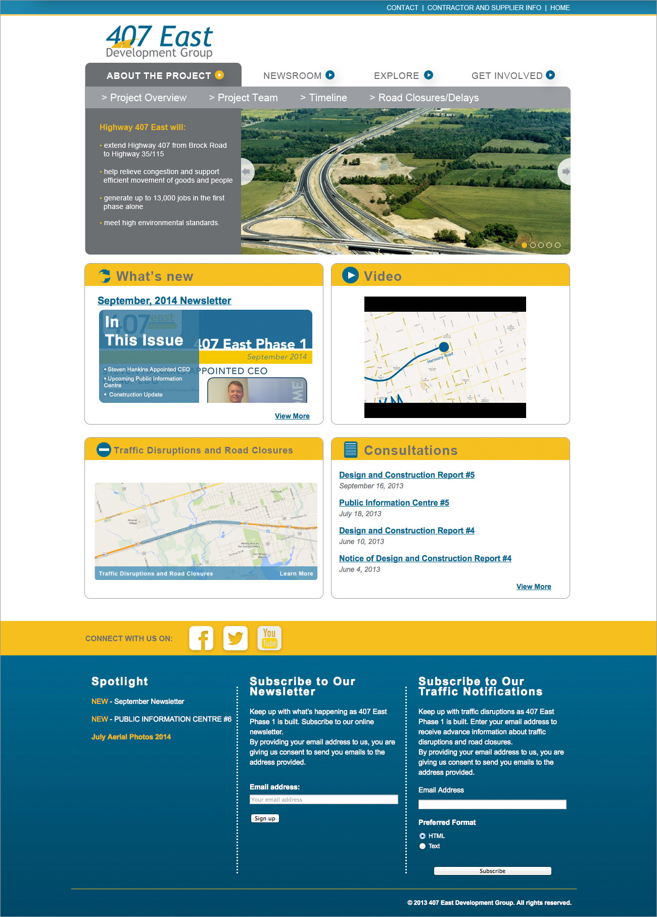 Highway 407 East Phase 1 is a $1 billion infrastructure project that will extend Highway 407 between Brock Road in Pickering to Harmony Road in Oshawa, connect Highway 407 East to Highway 401 and realign Highway 401 to accommodate the West Durham Line. Kryzma worked with Enterprise Canada to create Banners, an Online Newsletter and a Wordpress based Website for 407 East Development Group to keep the public connected with the construction progress using photography, videos, newsletters, maps, news and media updates, event information as well as information regarding road closures. Visit the website at www.407eastphase1.ca