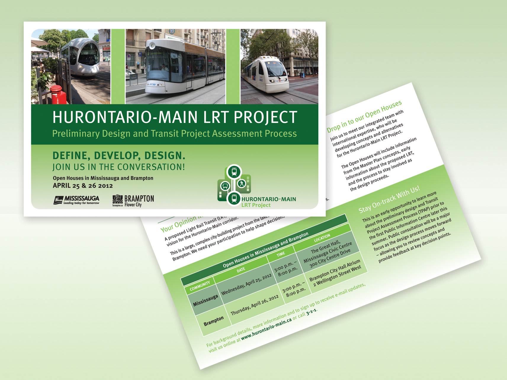 A proposed Light Rail Transit (LRT) system is a key part of Mississauga and Brampton’s vision for the Hurontario-Main corridor in Ontario. More than a transportation route, the LRT system is intended to be a means of economic and residential development, and improved quality of life throughout Mississauga and Brampton. Using the established brand colours, Kryzma worked with Enterprise Canada and SNC-Lavalin to create a logo, letterhead, ads, postcards, handouts, PowerPoint presentation, and discussion panel boards to help visually execute the proposed master plan and upcoming events with an engaging appearance.