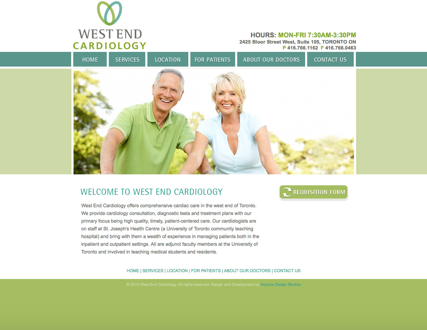West End Cardiology is a new company in the west end of Toronto offering comprehensive cardiac care. Kryzma was hired to create a logo design, website, stationary and brochure to promote their services among family doctors. West End Cardiology's professional and welcoming new image has been a great success. Visit the website at www.westendcardiology.com